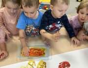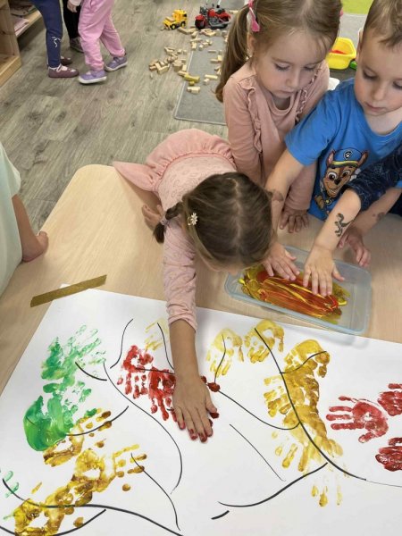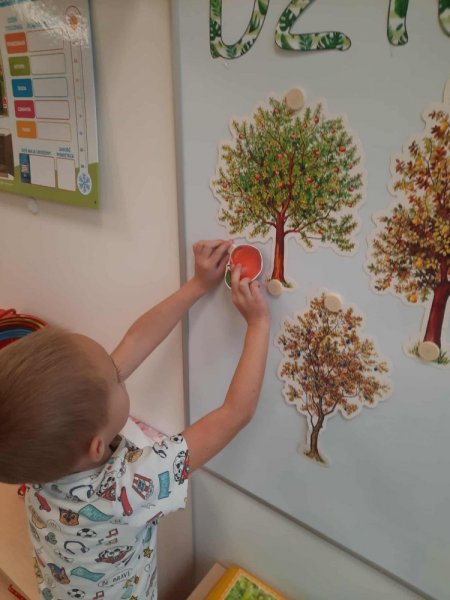 Dzieci uczestniczyły w rozmowach i zabawach edukacyjnych, podczas których dowiedziały się, dlaczego powinniśmy pielęgnować zieleń, jak drzewa oczyszczają powietrze i dają schronienie zwierzętom. Wspólnie oglądaliśmy liście różnych gatunków, rozpoznawaliśmy ich kształty i barwy, a także słuchaliśmy opowieści o tym, jak drzewa zmieniają się w kolejnych porach roku.