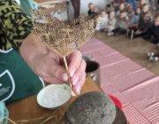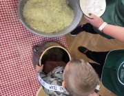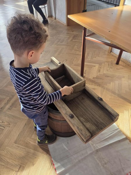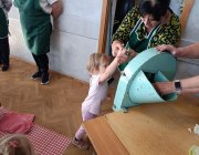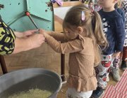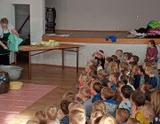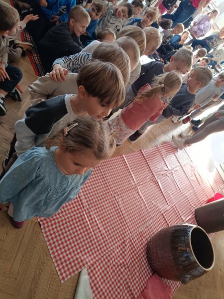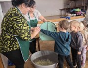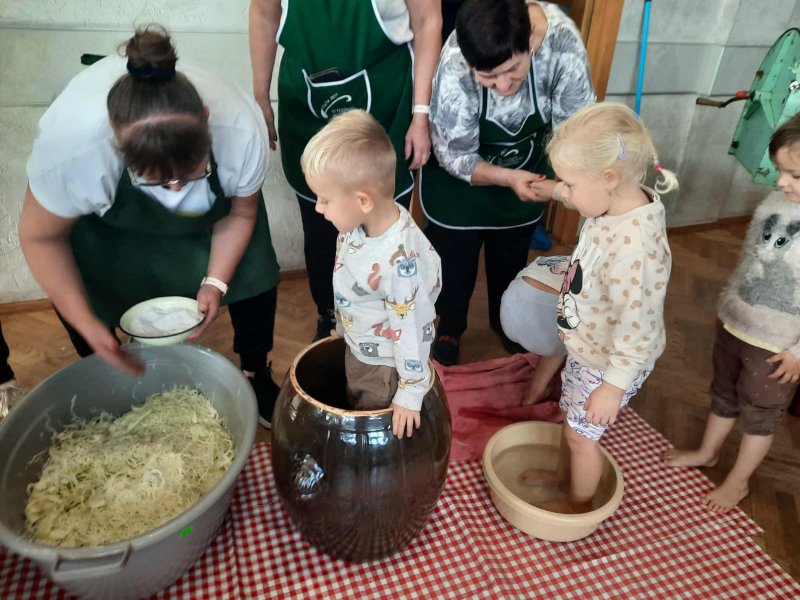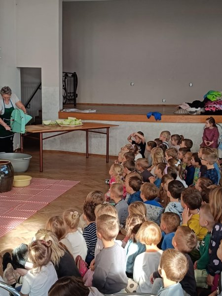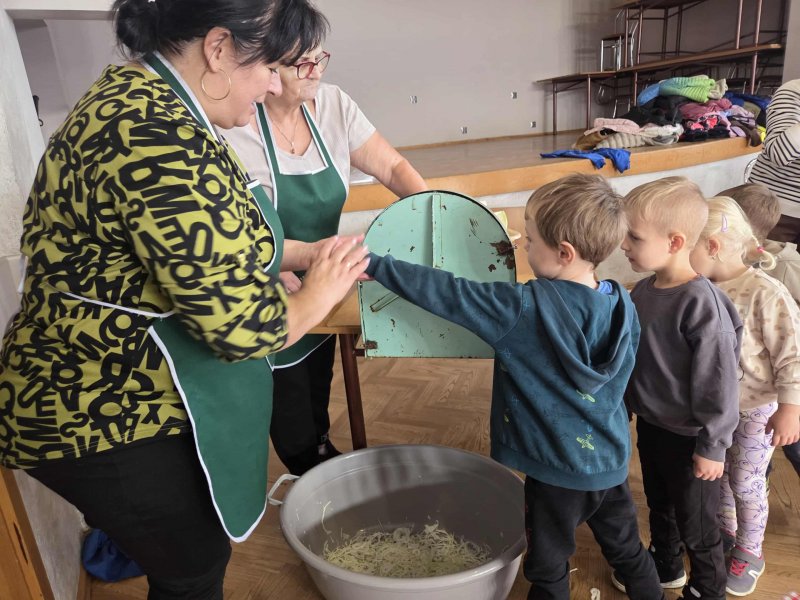 Pod czujnym okiem pań z KGW mali uczestnicy obejrzeli, jak dawniej przygotowywano kapustę do kiszenia, poznali potrzebne składniki i sami spróbowali swoich sił w ubijaniu kapusty w beczce.