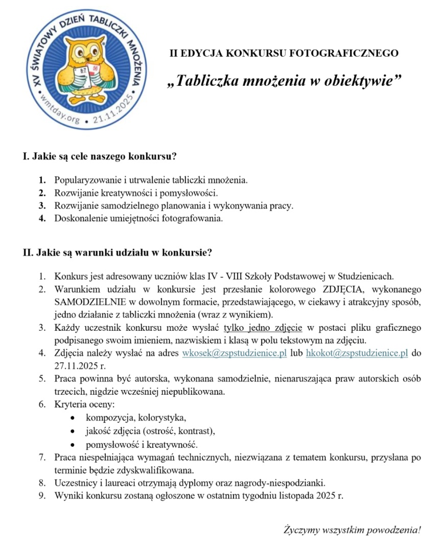 Serdecznie zapraszamy uczniów klas IV- VIII do udziału w szkolnym konkursie fotograficznym z okazji Światowego Dnia Tabliczki Mnożenia.