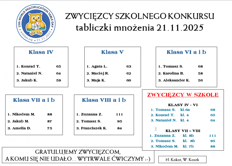 W piątek 21 listopada, wraz ze Światowym Dniem Życziwości oraz szkolnym Dniem Postaci z Bajek obchodziliśmy Światowy Dzień Tabliczki Mnożenia. W każdej z klas 4-8 przeprowadzono konkurs tabliczki mnożenia na czas, który miał wyłonić uczniów, którzy mają tabliczkę mnożenia w przysłowiowym "małym palcu" i biegle się nią posługują. Zwycięzcy poniżej na plakacie. Gratulujemy! Piąto- i szóstoklasiści utrwalali tabliczkę mnożenia odwiedzając przygotowane przez nauczyciela matematyki stacje zadaniowe.