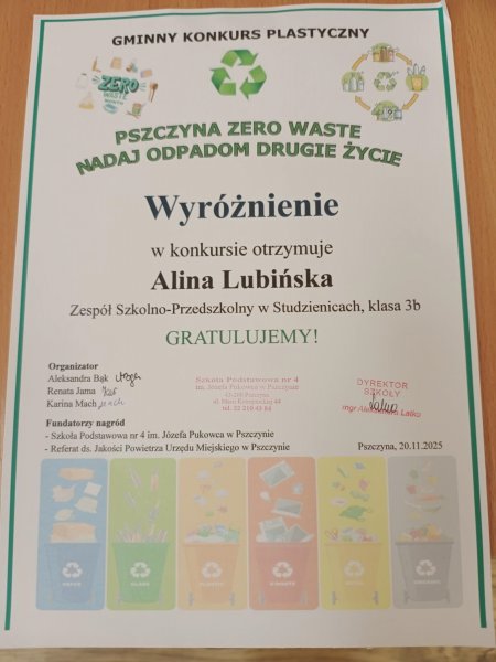 W Gminnym Konkursie Plastycznym pt. "Pszczyna zero waste. Nadaj odpadom drugie życie" organizowanym przez Szkołę Podstawową nr 4 w Pszczynie, dziewczyny z klasy 3b odniosły wielki sukces. Malwina Chrobok zdobyła ll miejsce, a Alina Lubińska wyróżnienie. Brawo dziewczyny! Serdecznie Wam gratulujemy i życzymy rozwijania swoich plastycznych talentów!