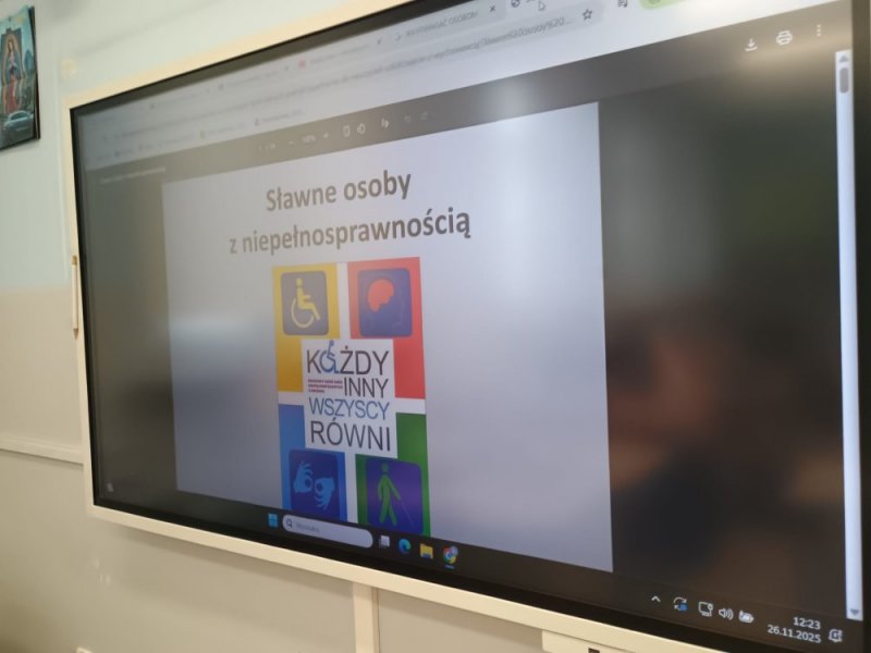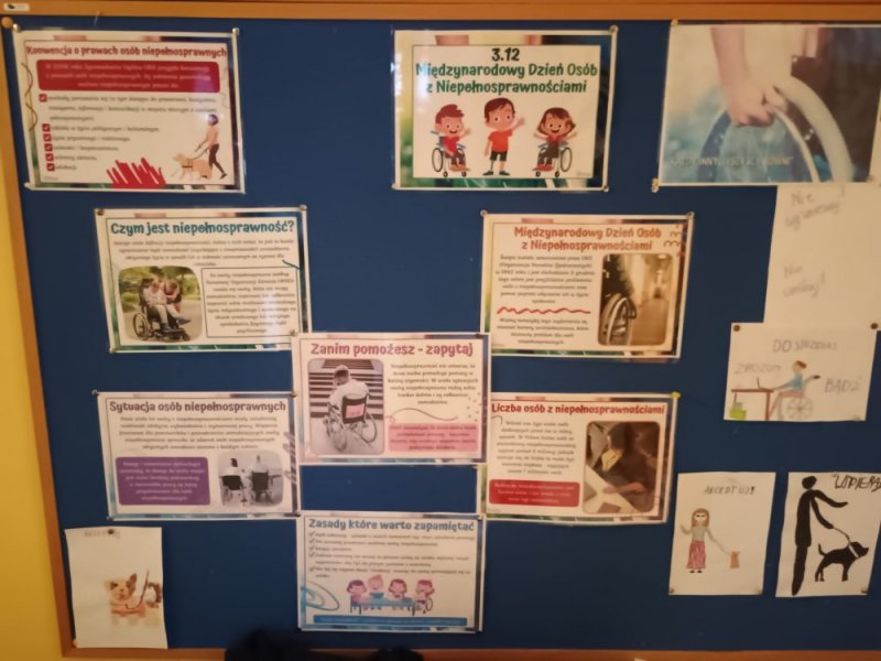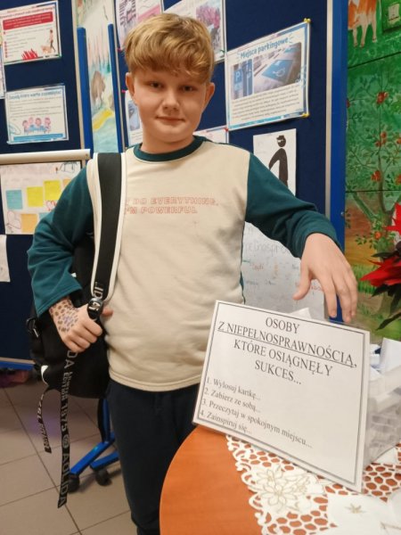 Podczas przerw pozostali uczniowie mogli zapoznać się z tematyczną gazetką oraz wylosować z pudełka karteczkę z historią znanej osoby z niepełnosprawnością, która osiągnęła sukces.