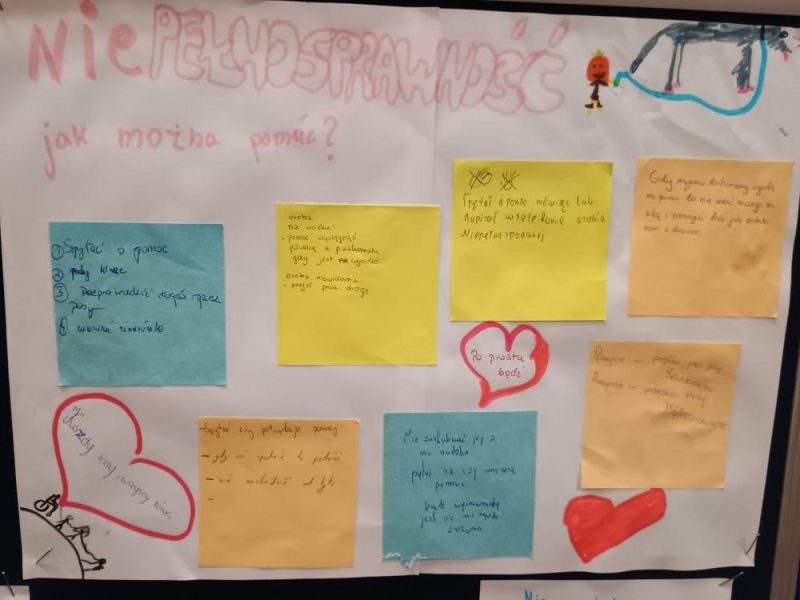Zastanawialiśmy się, co oznacza termin „niepełnosprawność”, z jakimi trudnościami mogą mierzyć się osoby jej doświadczające oraz w jaki sposób możemy wzajemnie się wspierać. Efekty działań zostały uwiecznione na plakatach.