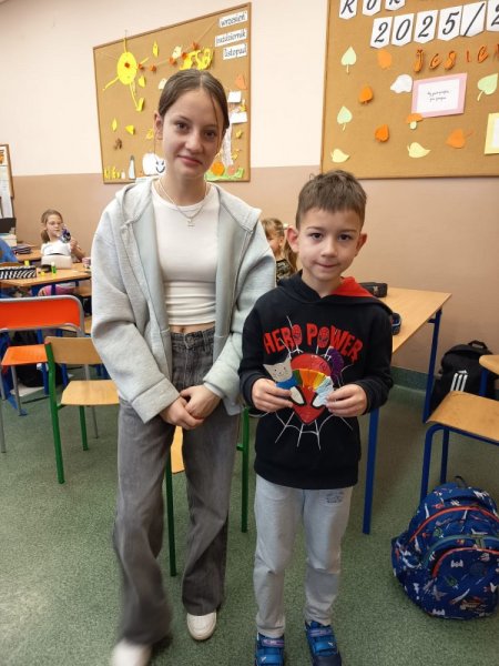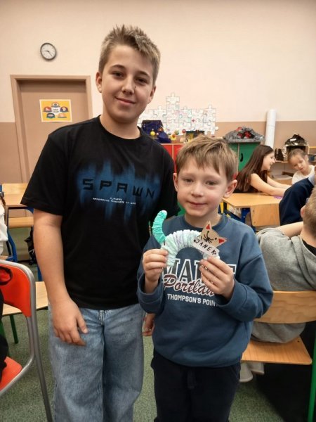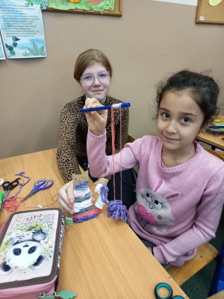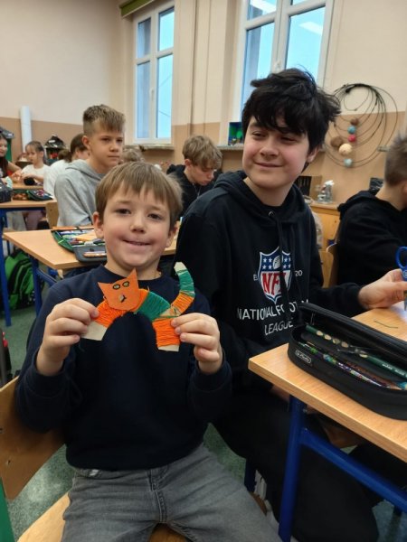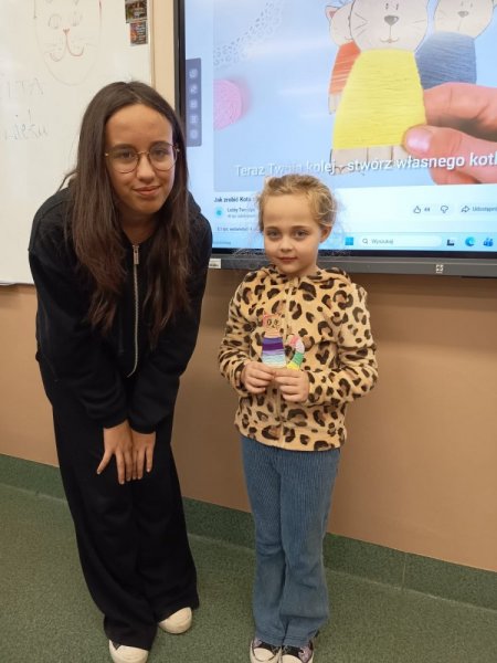 Uczniowie obu klas szóstych zaprosili na swoje zajęcia kreatywne naszych pierwszoklasistów. Wspólnie z nimi, pomagając i doradzając wykonali wełniane kotki. Podczas pracy uczniowie klasy pierwszej poznali nowych kolegów i koleżanki, mieli okazję porozmawiać ze starszymi uczniami, a nawet nawiązać nowe znajomości. Starsi uczyli się jak pomagać bez wyręczania, jak rozmawiać z młodszym kolegą, jak zachęcać i motywować do pracy.