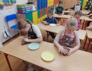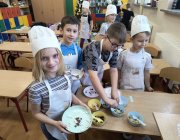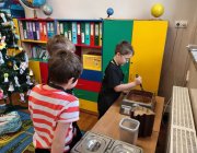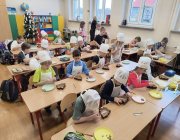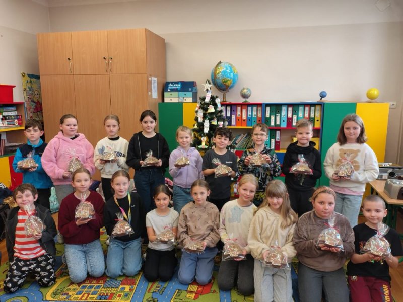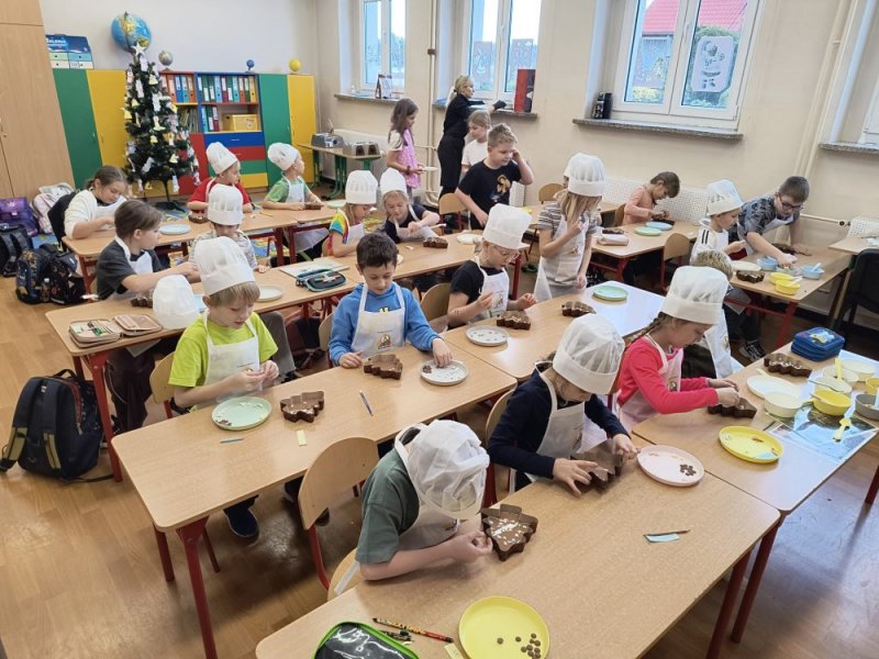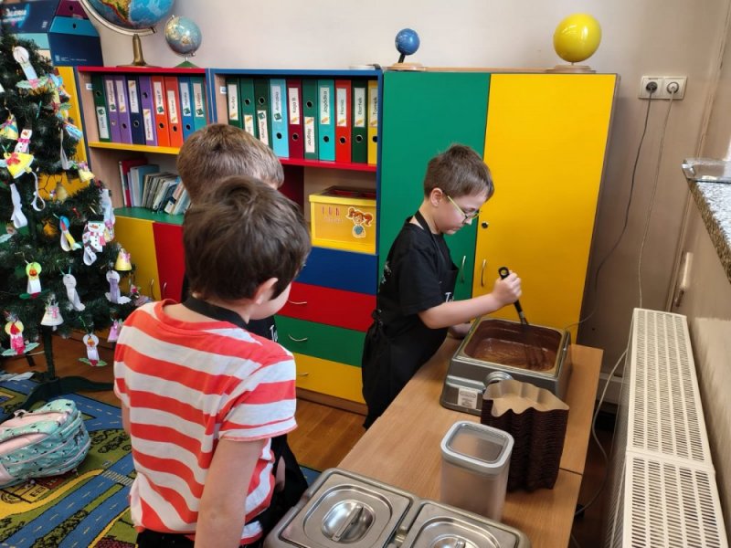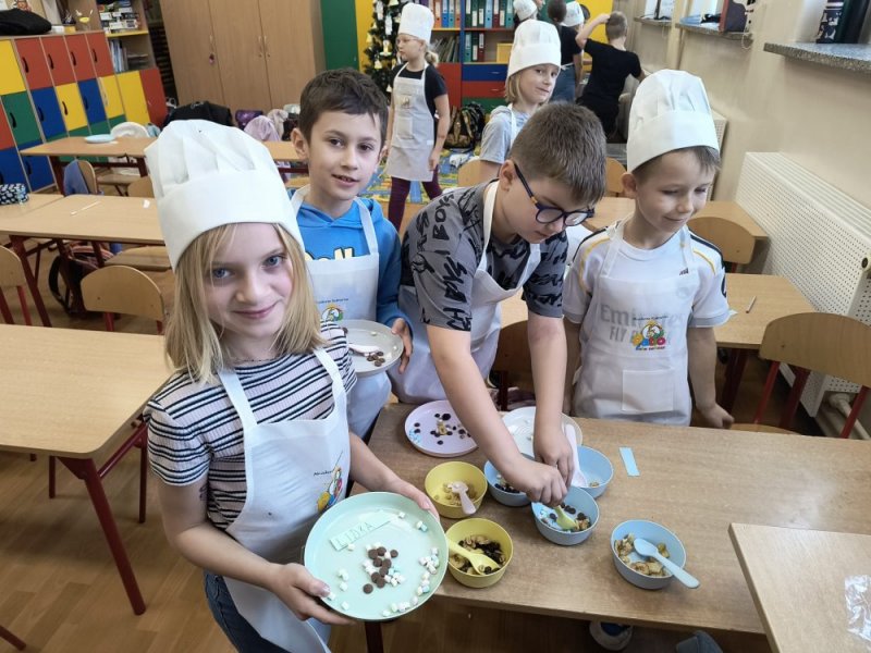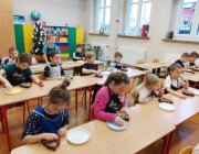 We wtorek 9 grudnia uczniowie klas 1-3 wzięli udział w przedświątecznych warsztatach czekoladowych przeprowadzonych przez panią z Jura Chocolate. Podczas warsztatów dzieci poznały historię czekolady i proces jej produkcji. Nauczyli się rozróżniać smaki i dodatki. Następnie założyli fartuszki, by przystąpić do części praktycznej, podczas której wykonali własną czekoladę ozdobioną ulubionymi dodatkami - suszonymi owocami, piankami, lentilkami lub bakaliami. Na koniec wykonane czekolady zostały zapakowane do celofanowych woreczków. Każdy z uczniów wrócił do domu z własnoręcznie wykonaną świąteczną czekoladą w kształcie choinki.
