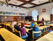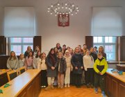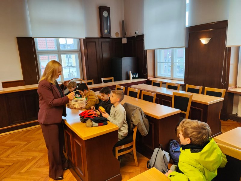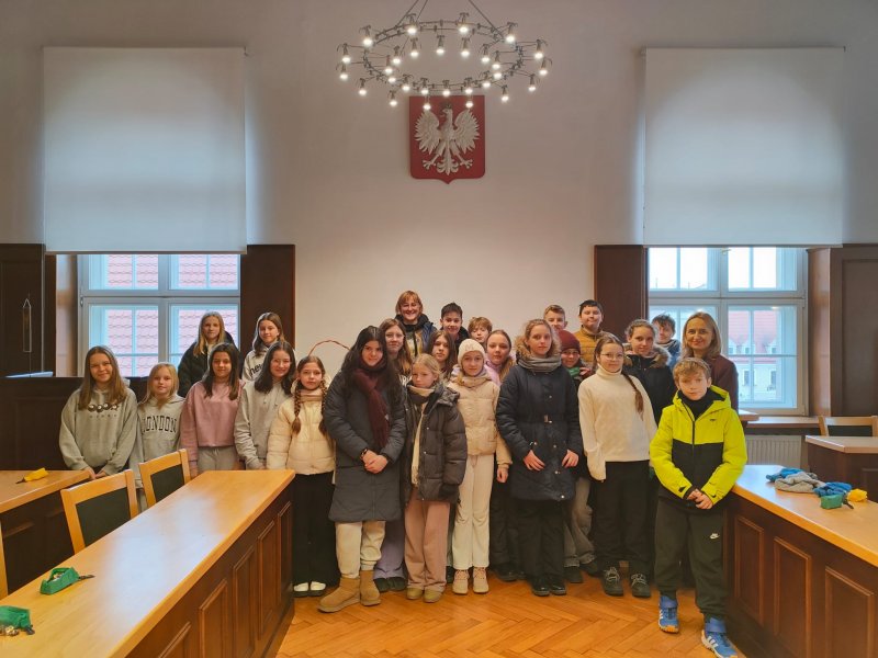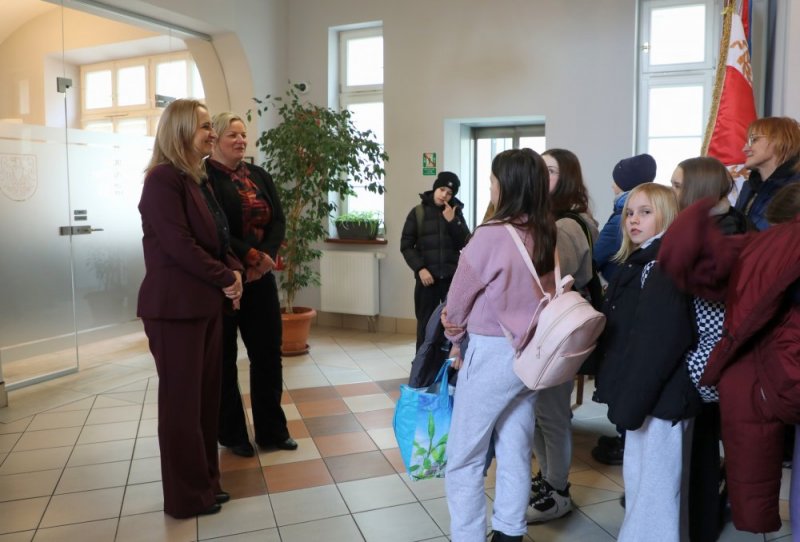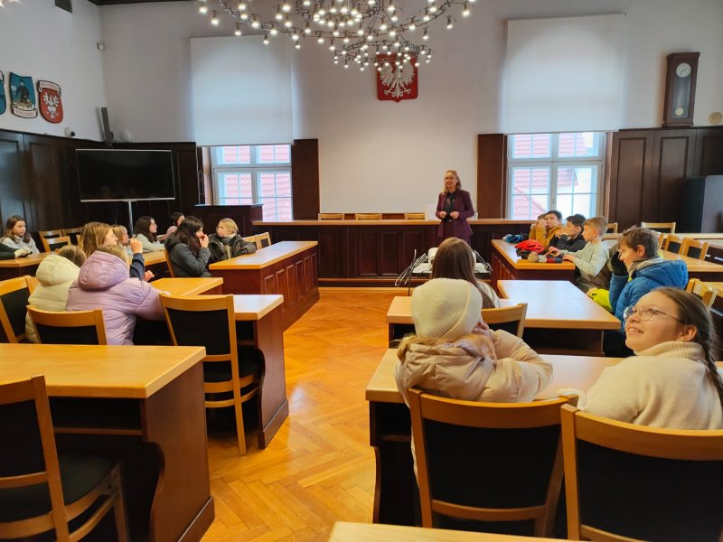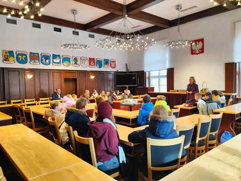 Po krótkiej regeneracji ciepłymi napojami uczniowie udali się do pobliskiego ratusza na lekcję edukacji regionalnej. W budynku pszczyńskiego Urzędu Gminy poznali Panią Magdalenę Czarnecką - zastępcę burmistrza, Panią Sekretarz - Łucję Foltyn oraz Panią Kierownik Urzędu Stanu Cywilnego - Beatę Rozmus. Każda z pań opowiedziała o swojej pracy i ciekawostkach z nią związanych. Odwiedziliśmy salę sesyjną, gabinet Pana Burmistrza oraz salę ślubów.