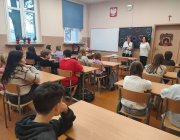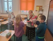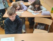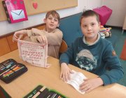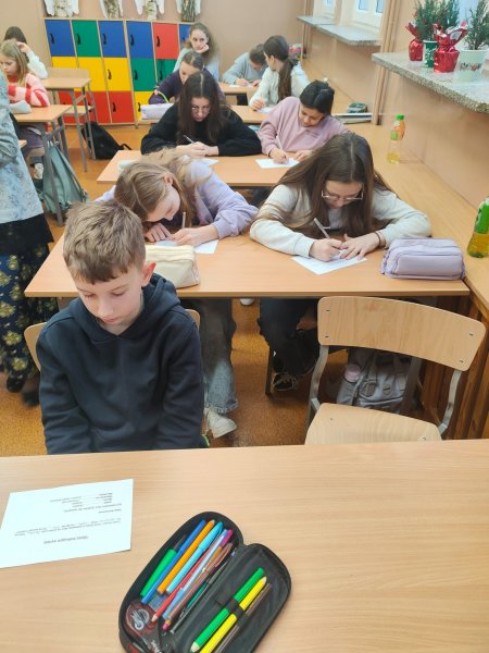 Klasy 3 i klasa 5 na spotkaniu wysłuchały jak powstała śląsko godka i z jakich języków obcych możemy się doszukiwać z śląskich słowach.