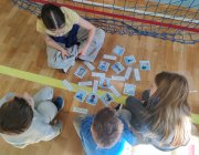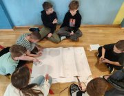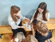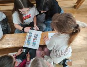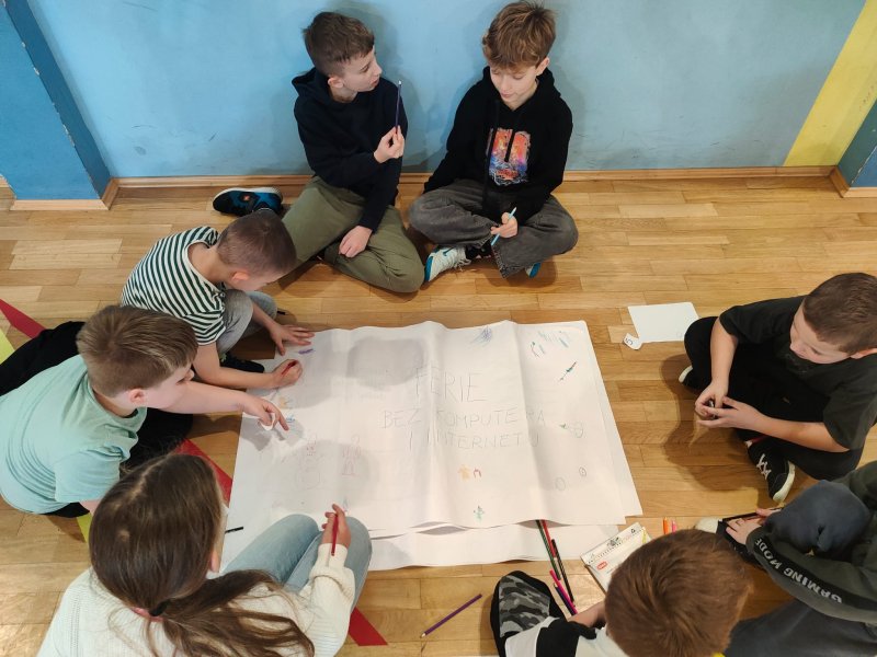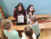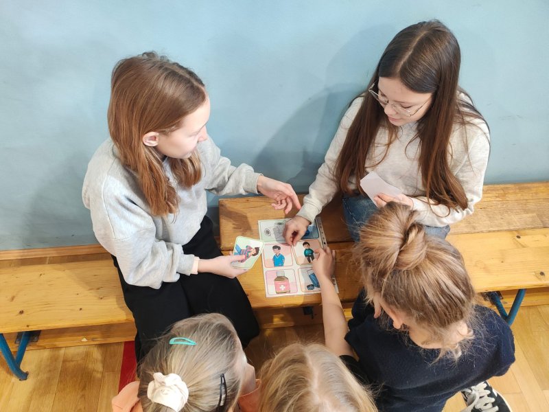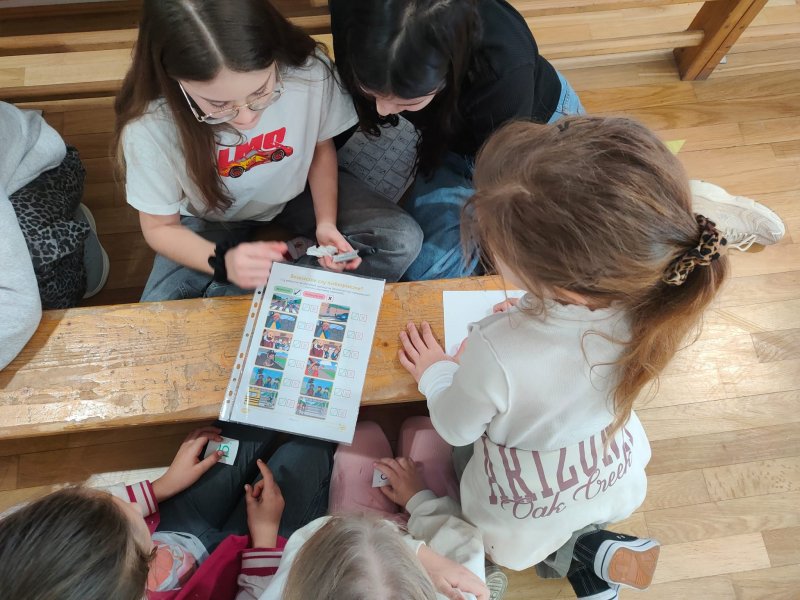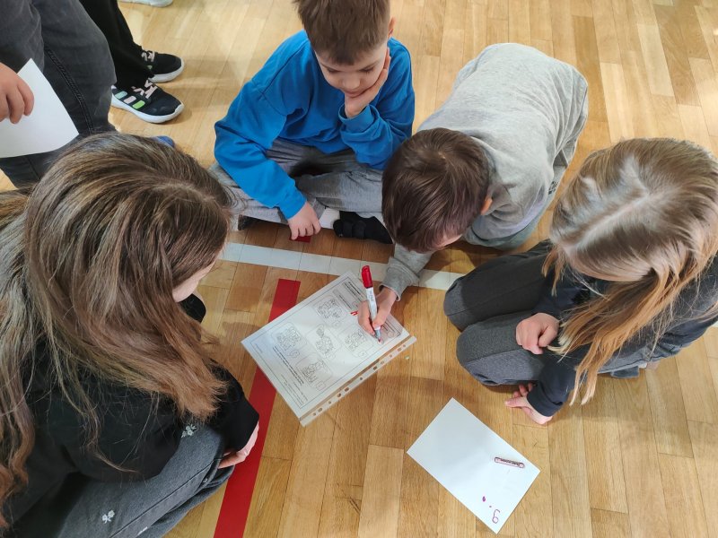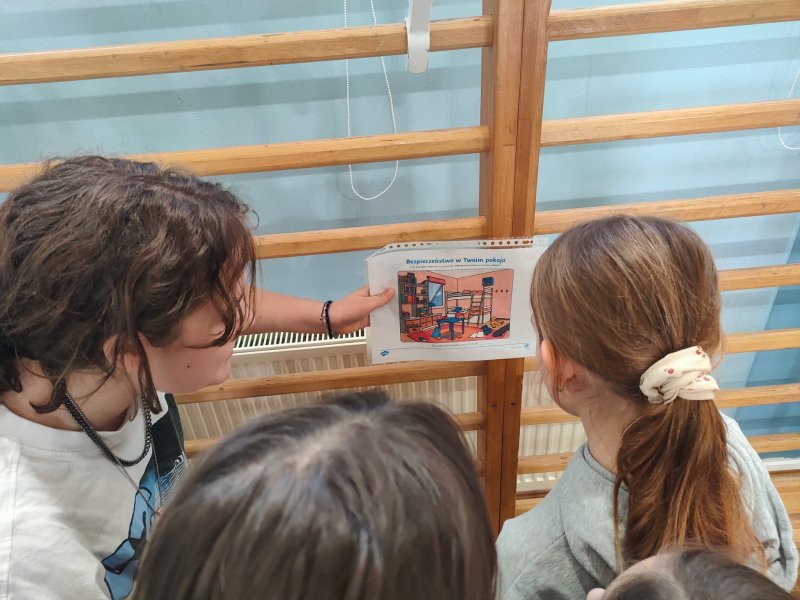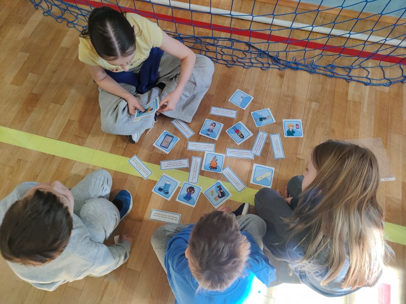 Uczniowie rozwiązywali zagadki, układali obrazki, odgrywali krótkie scenki i uczyli się, jak bezpiecznie zachować się w szkole, na drodze i w domu. Było dużo współpracy, ruchu i uśmiechu. Uczniowie klasy 5 i 6a byli przewodnikami dla młodszych kolegów.
