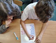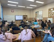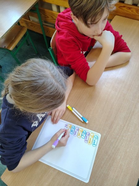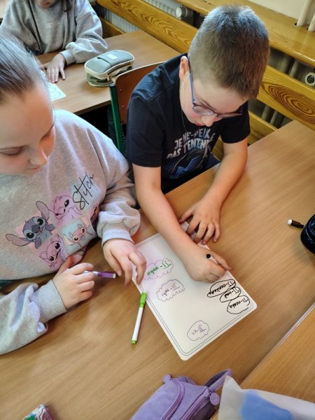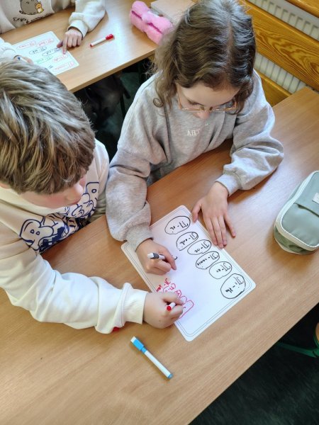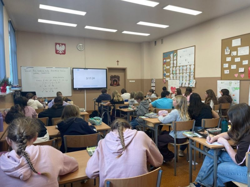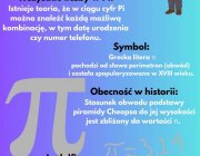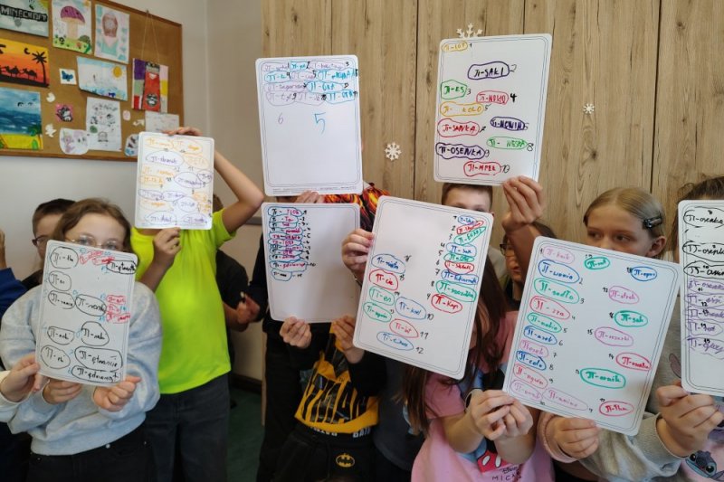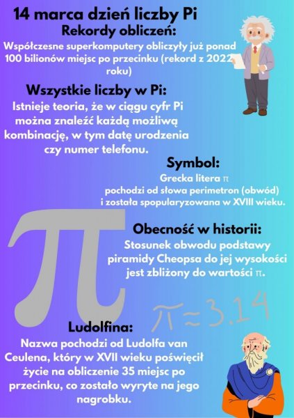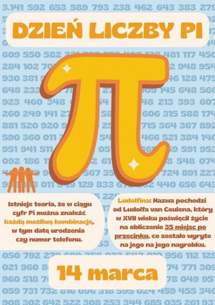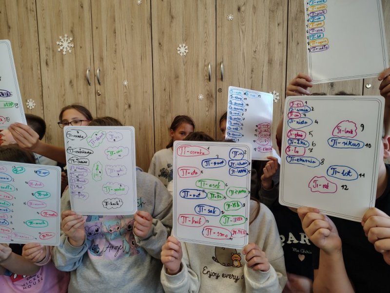 W tym roku to świętowanie zaplanowaliśmy na piątek 13 marca. Już rano przywitał nas muzyczny szkolny dzwonek z fragmentami radosnej piosenki "Matematyka to zabawa" i taki towarzyszył nam przez cały dzień. W klasach 4-5 i 6 uczniowie wzięli udział w konkursie na czas, gdzie zadaniem było wymyślenie jak największej liczby słów z sylabą "pi" lub zaczynających się od "pi". Uczniowie klas 7 rozwiązywali równania, gdzie wyniki ustawione w wyznaczonej kolejności utworzyły fragment rozszerzenia liczby Pi. Również na informatyce powstały w canvie kreatywne plakaty na temat tej niezwykłej liczby Pi. Brawo Uczniowie za radość i ogromne zaangażowanie we wspólnej matematycznej zabawie!