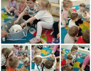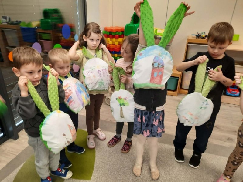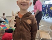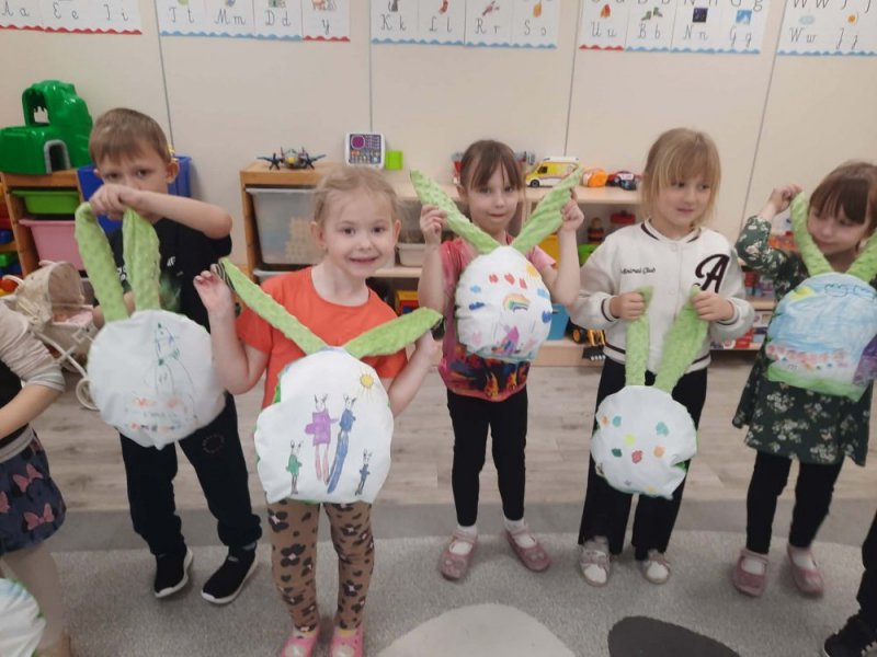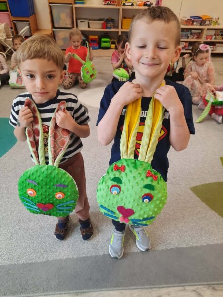 W tym samym czasie grupy Biedronki oraz Pszczółki pracowały nad swoimi przytulankami. Z pomocą kolorowych materiałów i dekoracji, każde dziecko stworzyło własną, niepowtarzalną maskotkę królika.