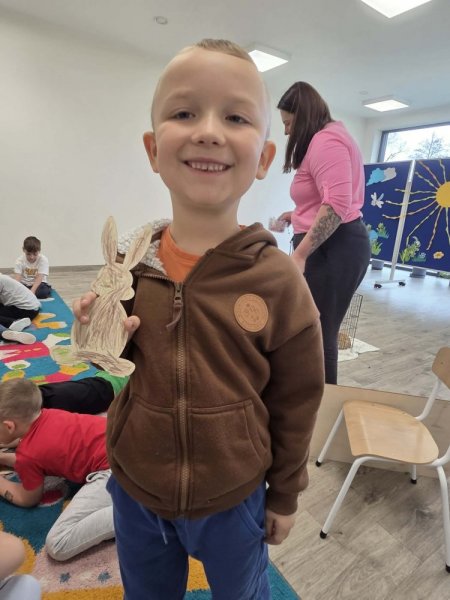 Po części teoretycznej dzieci własnoręcznie przygotowały pamiątkowe króliczki z drewna.